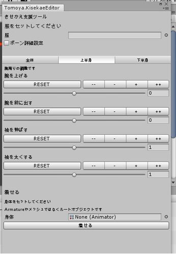 「キセテネ」はUnityでアバターの服を着せ替えるのを支援するツールです。 スライダーで各所のサイズ調整後、ボタン一つで素体に着せることができ、素体付き衣装に頭を乗せたり、髪型の変更にも対応しています。 ダウンロードはこちらから 基本の使い方(服…